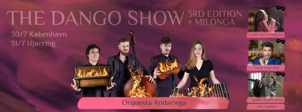 Dango THE DANGO SHOW 2025 3rd EDITION ONLY TWO DATES: 30th of July in COPENHAGEN 31st of July in HJØRRING Orquesta Andariega presents the DANGO-show together with: Victor Hugo Diaz, singer, AR Camilla Marie Dahlgreen, singer, DK Ayelén Álvarez Miño, dancer, AR José Lugones, dancer, AR Andariega consist of: Stine Helkjær Engen, bandoneón and conducting, DK Luigi Coviello, double bass and conducting, IT Gonzalo Lesta, violin. AR Mariano Flores Gonzalez, piano, AR For tickets and more information about the concert in Copenhagen For tickets and more information about the concert in Hjørring DANGO is a musical concept born out of a wish to unite two worlds; the Danish Song Book and tango. This has been done by creating tango versions of the best Danish melodies.